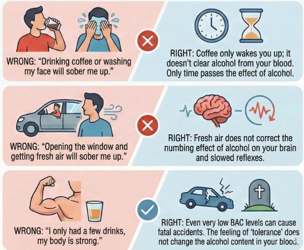 FACT: Coffee might wake you up, but it does not clear the alcohol from your blood or restore your reflexes. The only thing that can eliminate the effects of alcohol is time.