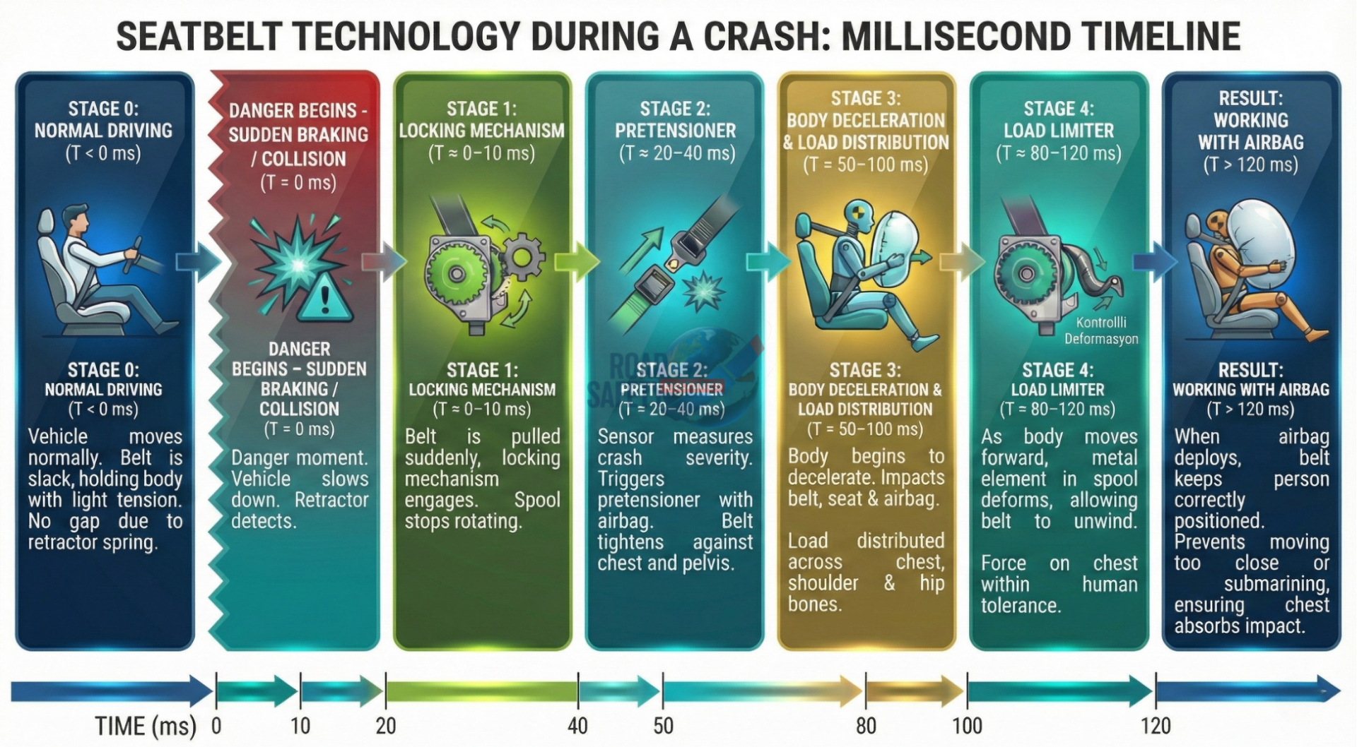- This entire process takes place within the first 100 milliseconds. The goal is to "catch" the body in the seat in a controlled manner before it strikes the steering wheel, dashboard, or windshield, or is ejected from the vehicle, and to extend the human body's deceleration time to reduce fatal internal injuries.