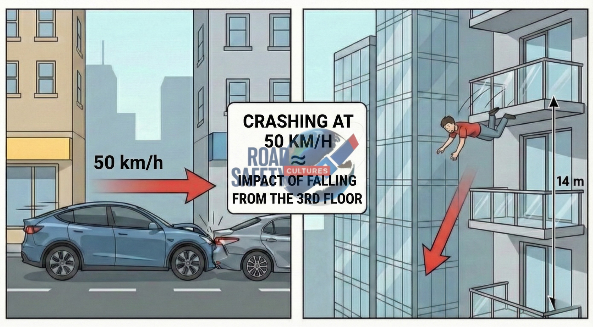 Crashing into a wall at 30 km/h (the speed of a cyclist) generates an impact equivalent to falling from the 3rd floor. If you are not wearing a seatbelt, your body absorbs this impact directly through the rib cage and head area.