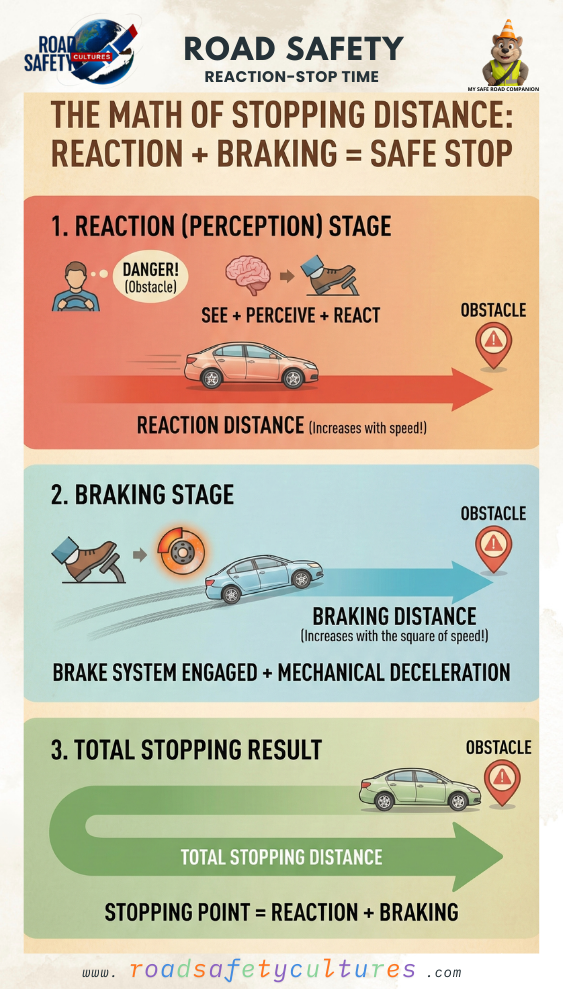 - What it Covers: It includes the time the driver takes to perceive the danger, lift their foot off the gas, and move it to the brake (Reaction Time) + the time the brake takes to stop the vehicle (Braking Time).