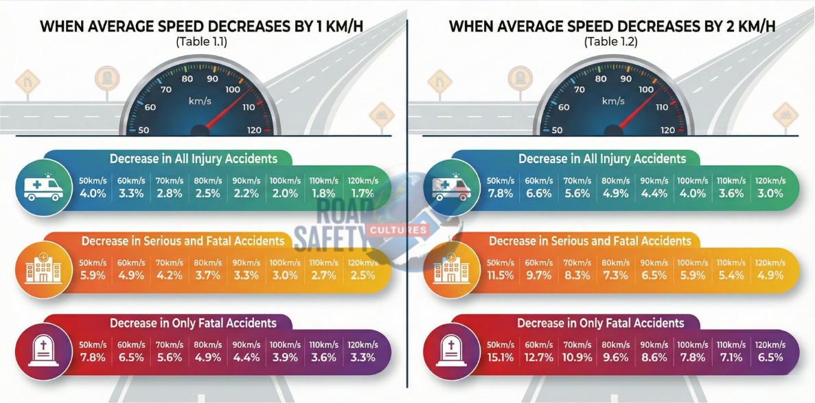- Various studies in Europe report a 25–40% reduction in pedestrian fatalities in cities that reduced the speed limit from 50 km/h to 30 km/h.
