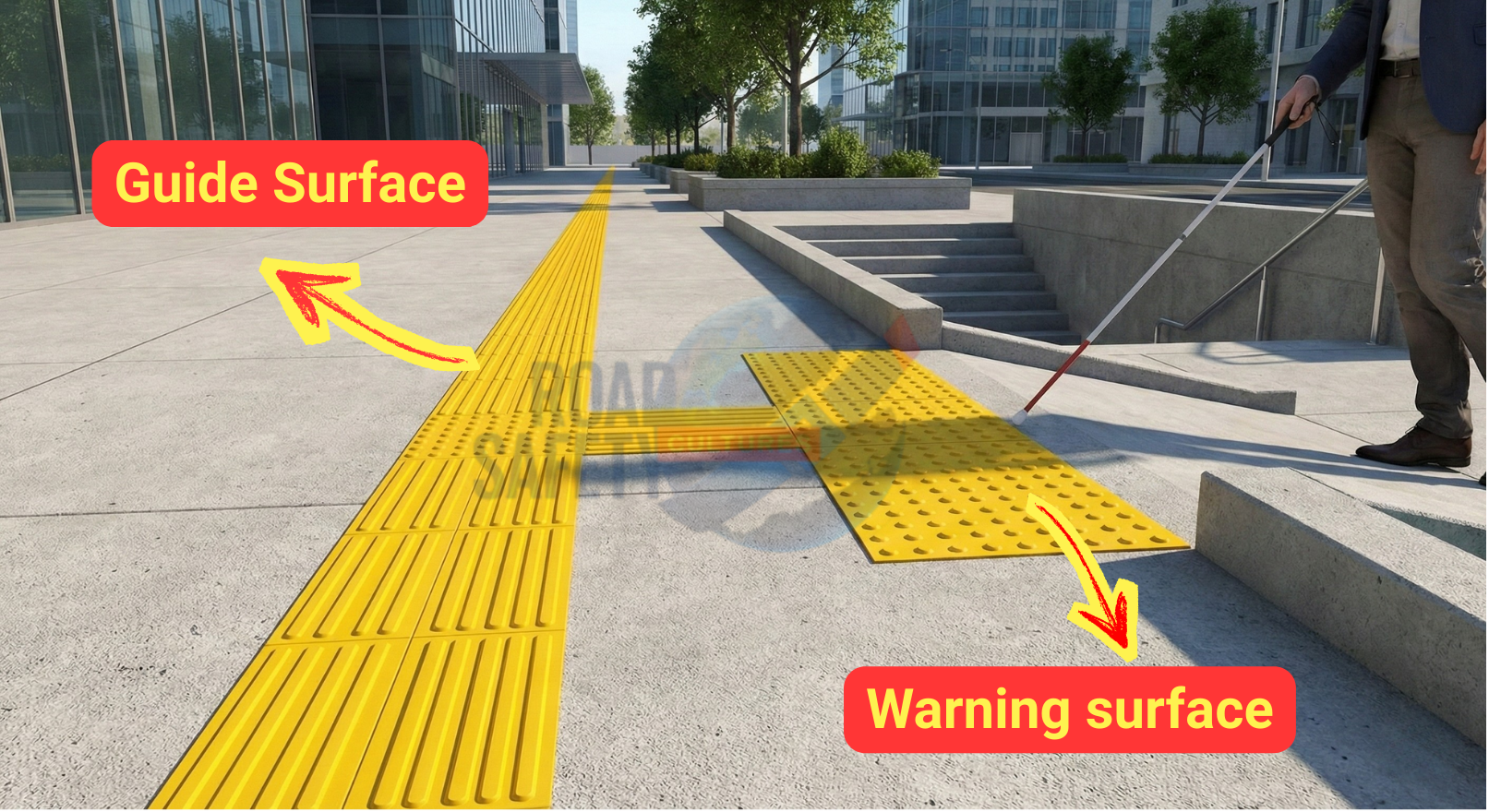Warning (Hazard) Textures: These are typically found at bus stops, the top of stairs, or at points where the direction changes. They signify: "Caution! There is a hazard or a change in path—stop!"