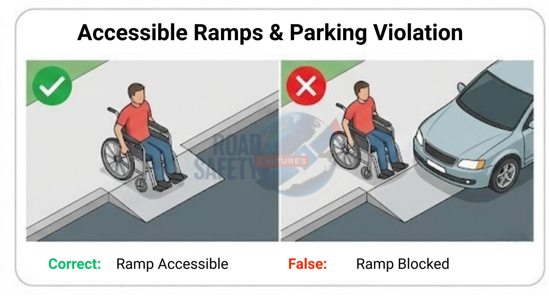 Curb ramps serve as the only safe "bridge" between the road and the sidewalk for wheelchair users and individuals with limited mobility. Parking the front of a vehicle in front of a ramp destroys this bridge and forces the individual onto the main road, putting them in danger. As a result of these errors, individuals with disabilities face serious risks of falling or tipping over while trying to navigate steep curbs. A true traffic culture requires never blocking these ramps, even for a single second.