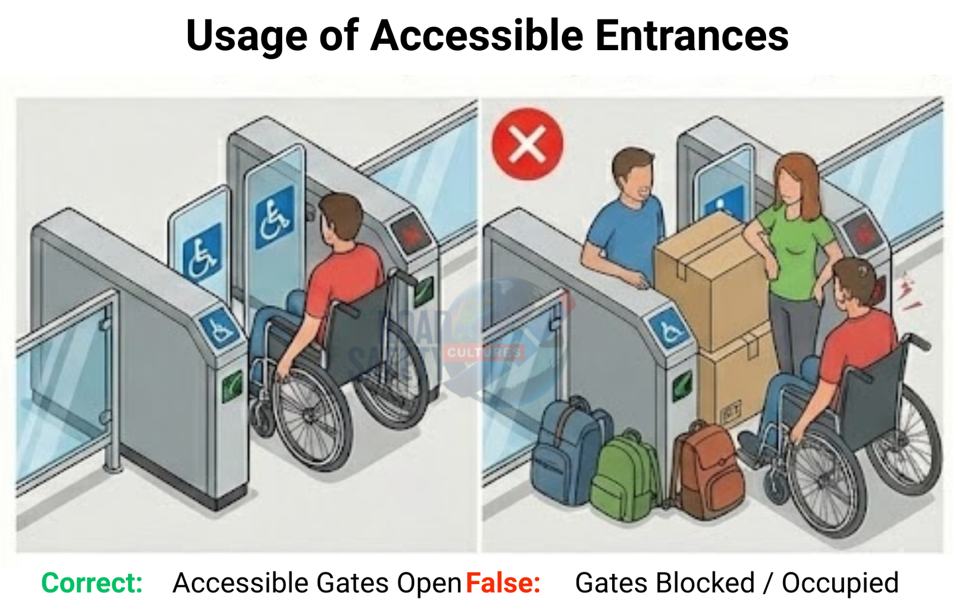 The wide access gates found in transportation stations are specifically sized so that individuals using wheelchairs or assistive devices can pass through comfortably. Waiting in front of these gates or occupying these areas with luggage and belongings disrupts the flow, causing stress and physical obstruction for individuals with disabilities. Equal and accessible traffic for everyone is built through these small acts of awareness.