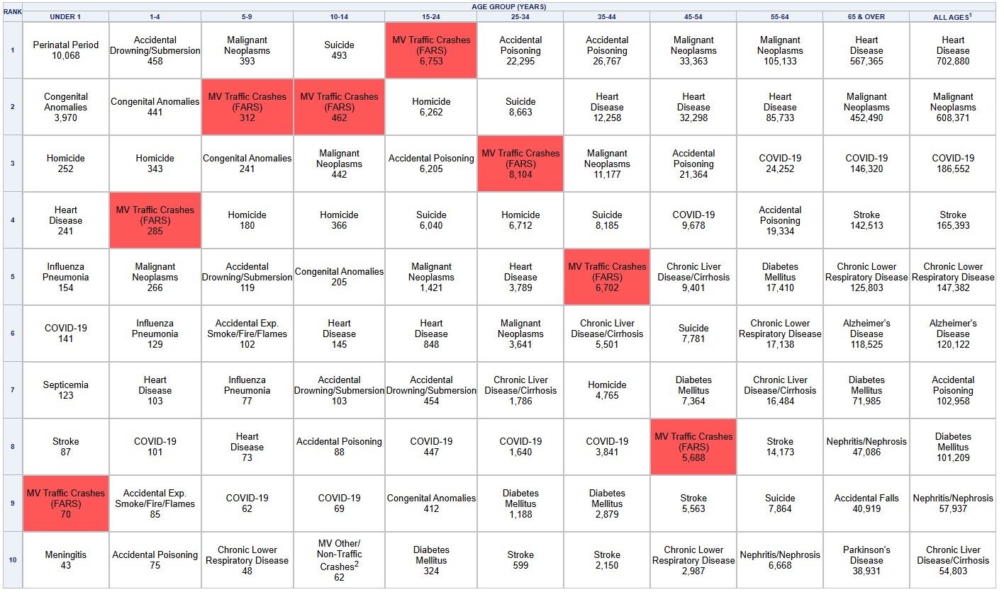 According to the analysis prepared by the United States Department of Transportation for 2022, traffic accidents are the leading cause of death for the 15–24 age group.