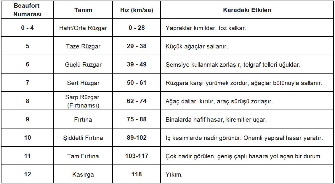 Denizcilikte ve karada rüzgarın gücünü anlamak için kullanılan en yaygın ölçek Beaufort Ölçeği'dir. Sürücülerin özellikle 6. dereceden itibaren (Güçlü Rüzgar) dikkatli olması gerekir.