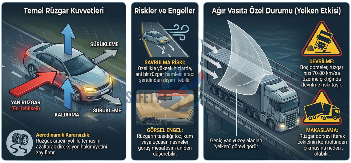 Ağır vasıtalar, geniş yan yüzey alanları nedeniyle rüzgara karşı bir "yelken" görevi görürler.