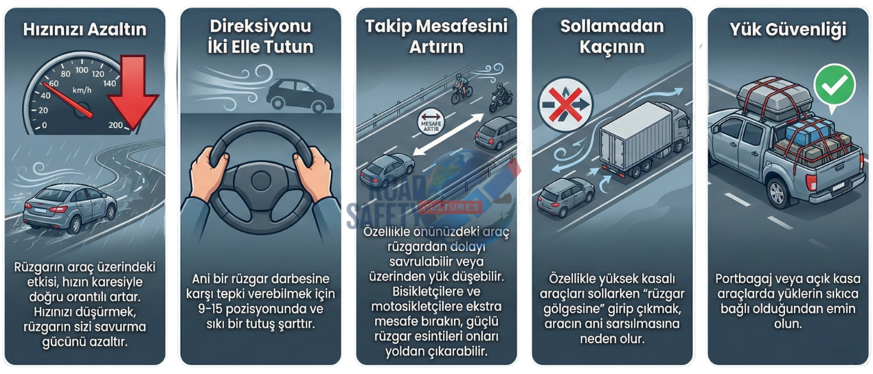 Hızınızı Azaltın: Rüzgarın araç üzerindeki etkisi, hızın karesiyle doğru orantılı artar. Hızınızı düşürmek, rüzgarın sizi savurma gücünü azaltır.
