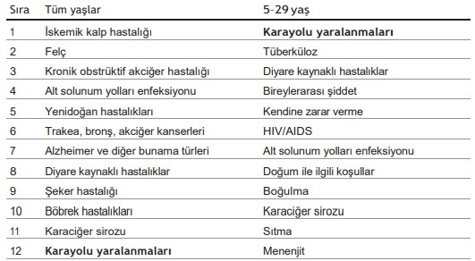 Tüm nedenlere bağlı ölümlerin yaş dağılımına bakıldığında, 2019 verilerine göre karayolu trafik yaralanmaları, 5-29 yaş arası çocuklar ve gençler için en önde gelen ölüm nedeni olmaya devam etmektedir. Bu demografik gruptaki bireylerin trafik kazalarından korunması, toplumsal bir sorumluluk haline gelmiştir.