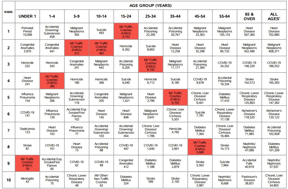 Amerika Birleşik Devletleri Ulaştırma Bakanlığının 2022 yılı için hazırladığı analizde; 15-24 yaş grubunda trafik kazalarının en çok ölüme sebebiyet veren olaydır.