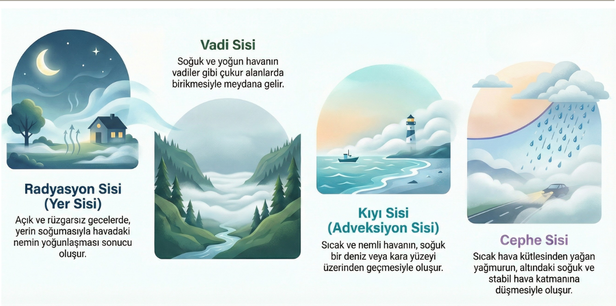 Deniz/kıyı sisi: Sıcak-nemli hava daha soğuk bir yüzeyin (deniz/soğuk kara) üzerinden geçip soğuduğunda oluşur; kıyılarda yaygındır.