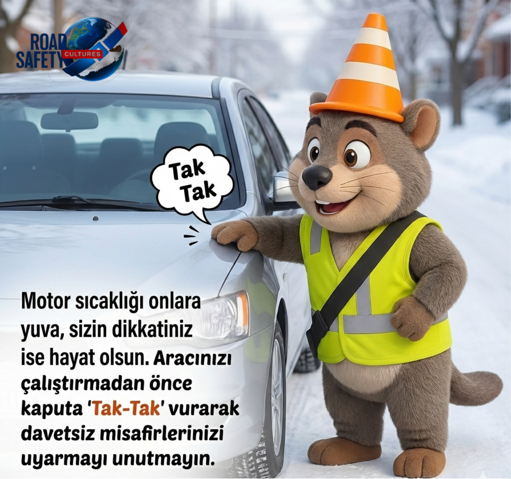 "Soğuk havalarda ısınmak isteyen minik dostlarımız, araçların motoruna veya tekerlek boşluklarına sığınabiliyor. Kontağı çevirmeden önce kaputa vuracağınız bir 'Tak-Tak', onları uyararak hayata tutunmalarını sağlar. Lütfen kontrol etmeden yola çıkmayın, küçük bir sesle bir hayat kurtarın."