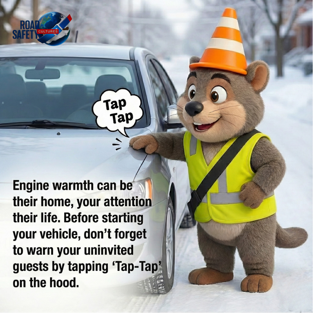 "In cold weather, our little furry friends may seek shelter in the engine compartments or wheel wells of vehicles to keep warm. A simple 'tap-tap' on the hood before turning the ignition will alert them and help them survive. Please don't set off without checking; save a life with a small sound."