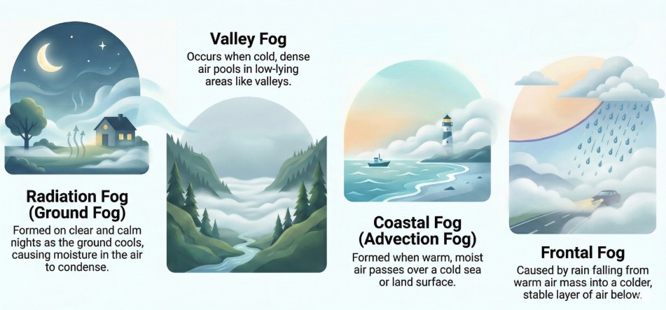 Sea/Coastal Fog: Forms when warm, moist air passes over a colder surface (sea/cold land) and cools down; common in coastal areas.